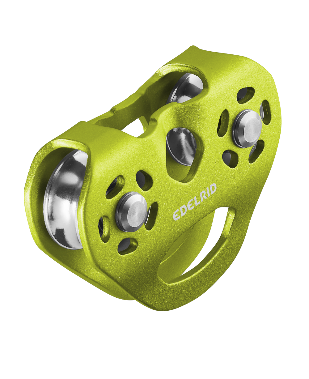 The WARP double pulley features ball-bearing-mounted stainless steel rollers, optimized for minimal friction and maximum efficiency, achieving a 92% efficiency rating. These rollers are designed to withstand wear from steel ropes while also performing flawlessly with fabric ropes. The large opening provides ample space for two carabiners, and the connection point at the top allows for redundant system setups with double rope guidance, enhancing safety and reliability.